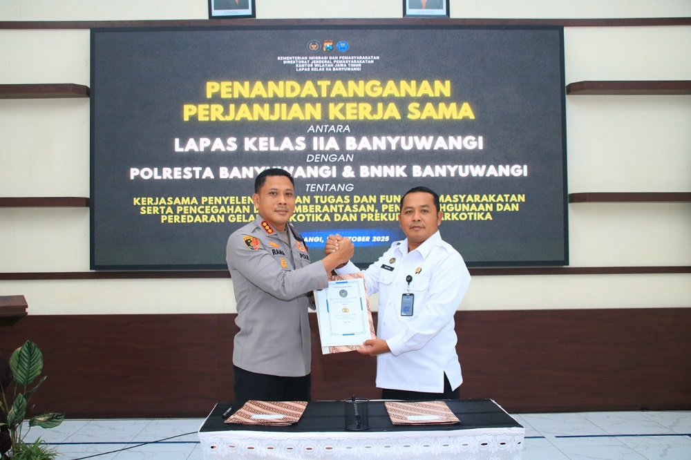radiovisfm.com – Lembaga Pemasyarakatan (Lapas) Kelas IIA Banyuwangi semakin menegaskan komitmennya dalam melakukan pencegahan dan pemberantasan peredaran gelap narkoba di dalam Lapas. Langkah tegas ini diwujudkan melalui penandatanganan perjanjian kerja sama yang dilakukan dengan Kepolisian Resor Kota (Polresta) Banyuwangi dan Badan Narkotika Nasional Kabupaten (BNNK) Banyuwangi, Kamis (23/10).