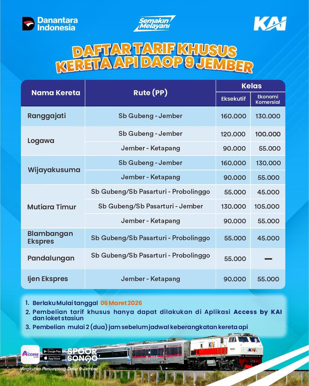radiovisfm.com — PT Kereta Api Indonesia (Persero) Daop 9 Jember kembali menghadirkan program Tarif Khusus untuk sejumlah perjalanan kereta api di wilayah operasionalnya. Program ini mulai berlaku sejak 6 Maret 2026 dan ditujukan untuk memberikan alternatif perjalanan yang lebih terjangkau bagi masyarakat tanpa mengurangi aspek keselamatan, kenyamanan, dan ketepatan waktu.